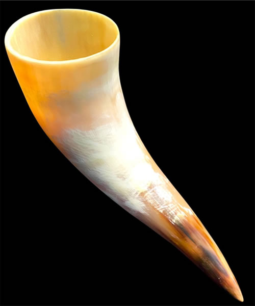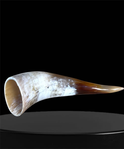 Authentic cattle blowing horns with Viking-inspired designs. Produces resonant, high-pitched tones. Ideal for reenactments, rituals, or performances. Available in 12”, 14”, and 16” sizes.